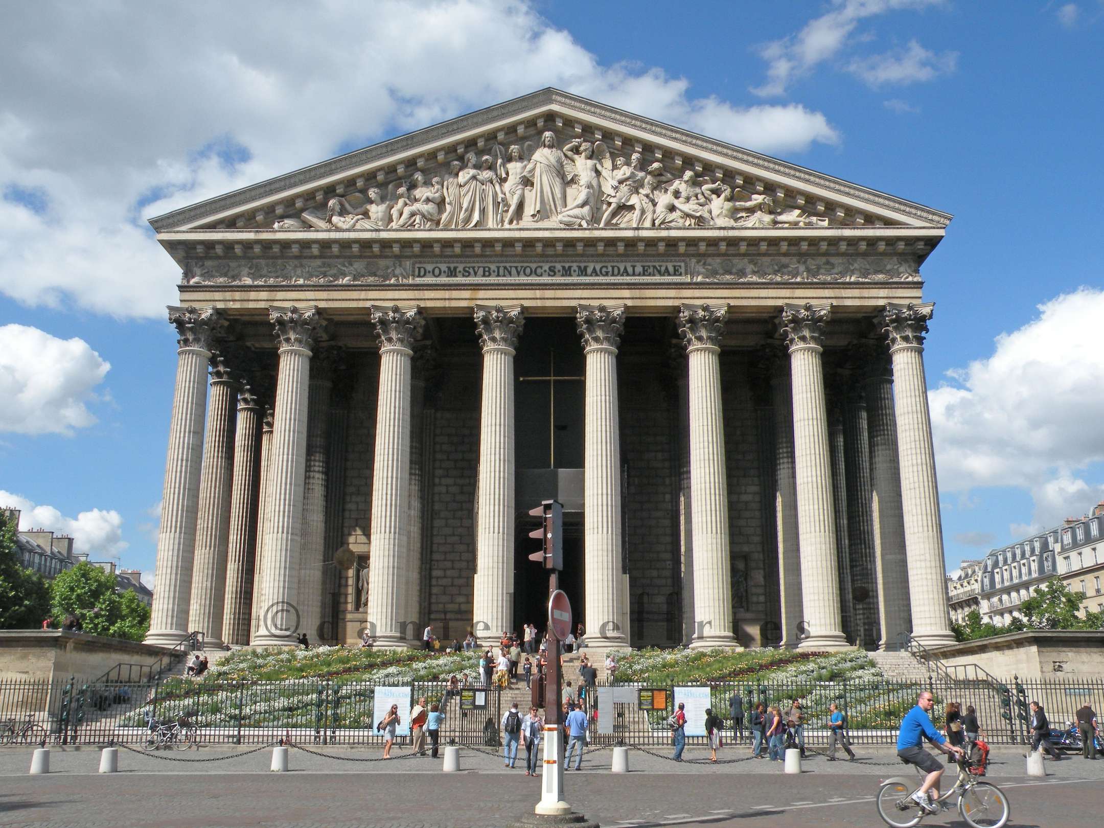 The Pediment Frieze of the church was designed in 1829 by Philippe Joseph Henri Lemaire, and is considered to be a masterpiece of Bourbon Restoration work. It is based on The Last Judgement, and depicts Christ the Judge at the centre of the composition. On his right, you can see archangel Gabriel with his horn announcing the Day of Judgement, while on his left, the archangel Michael is shown wielding the sword of Justice. There is also a figure of Mary Magdalene shown kneeling at the foot of Christ.