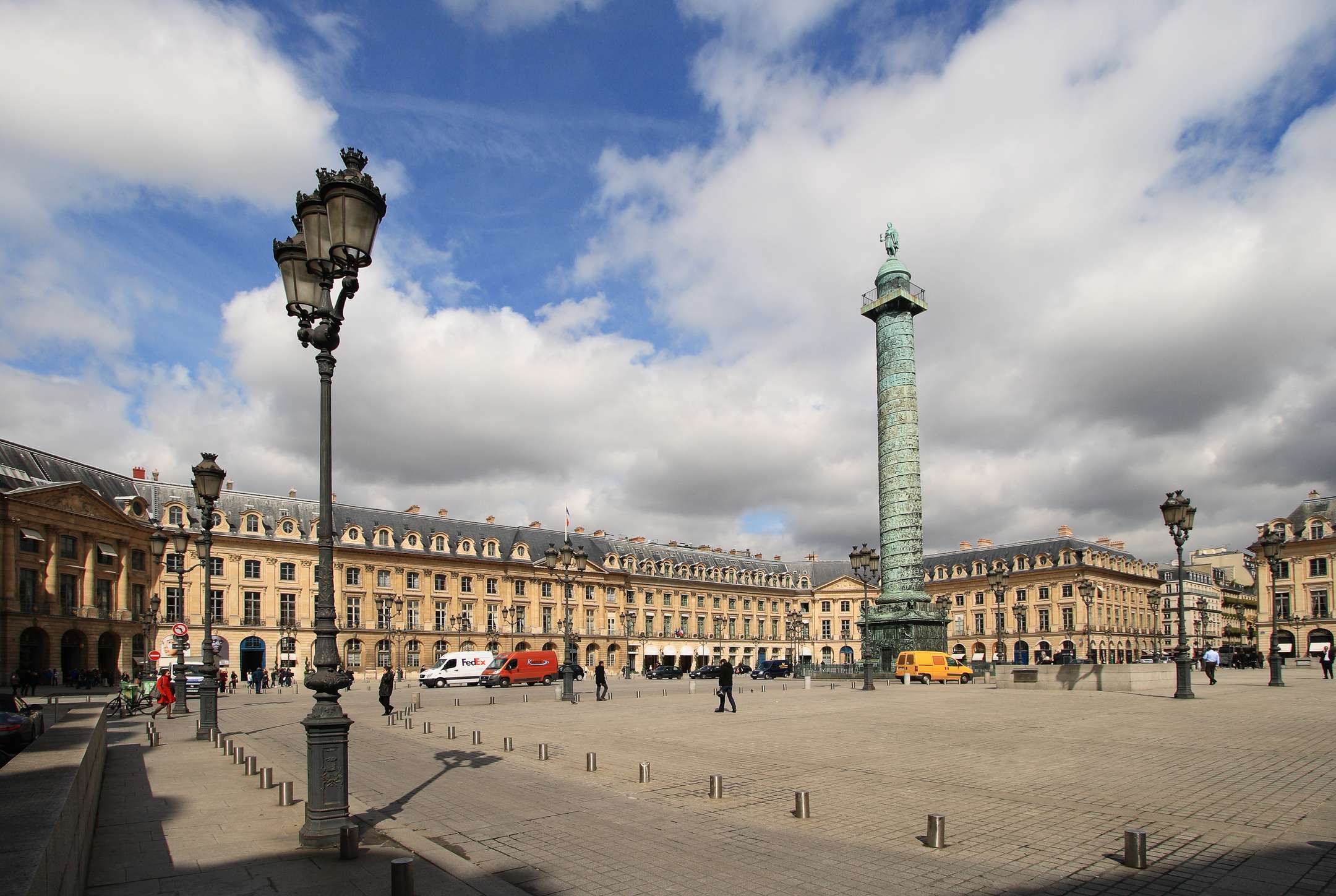 The main landmarks at Place Vendôme are the Vendôme Column, the Ritz Paris hotel, and the Hôtel de Vendôme.